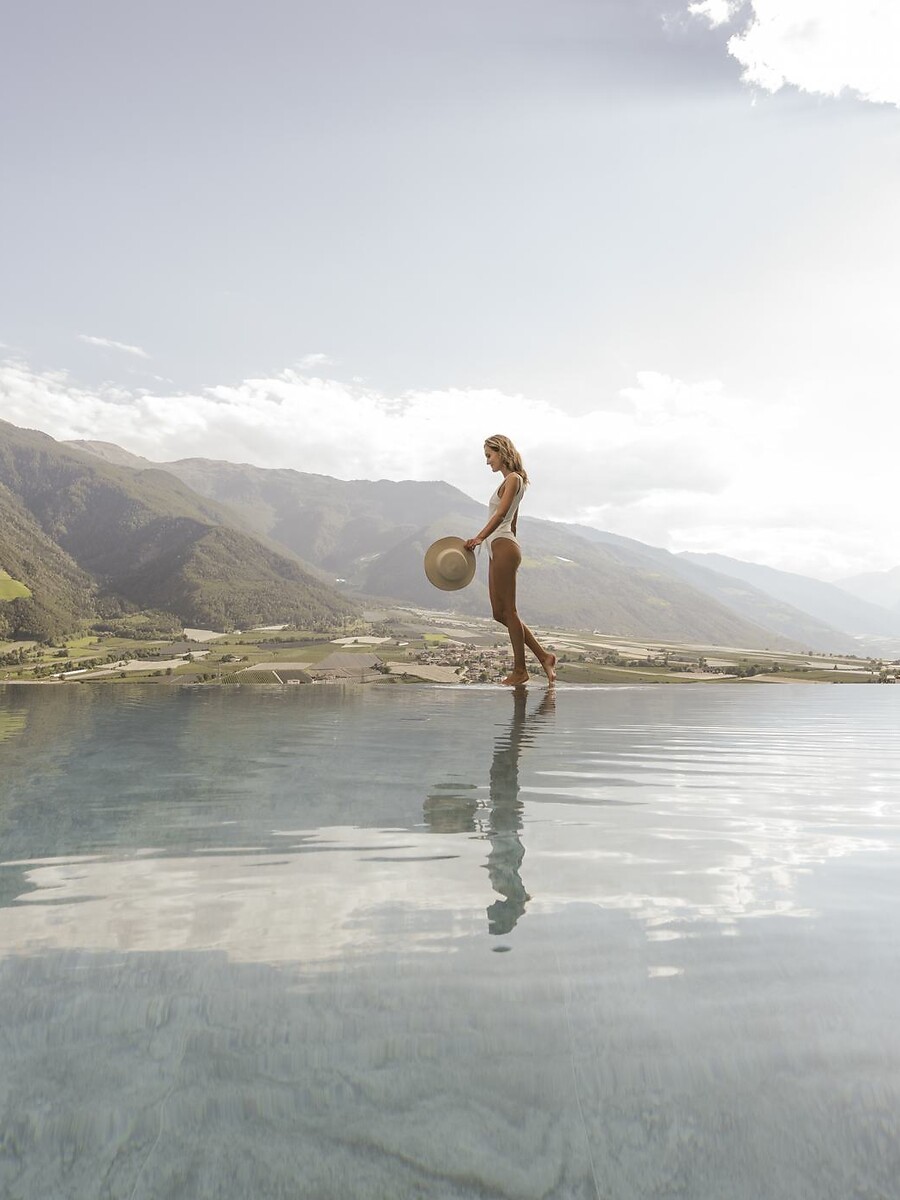 Frau im Infinity Sky Pool mit Dolomitenblick