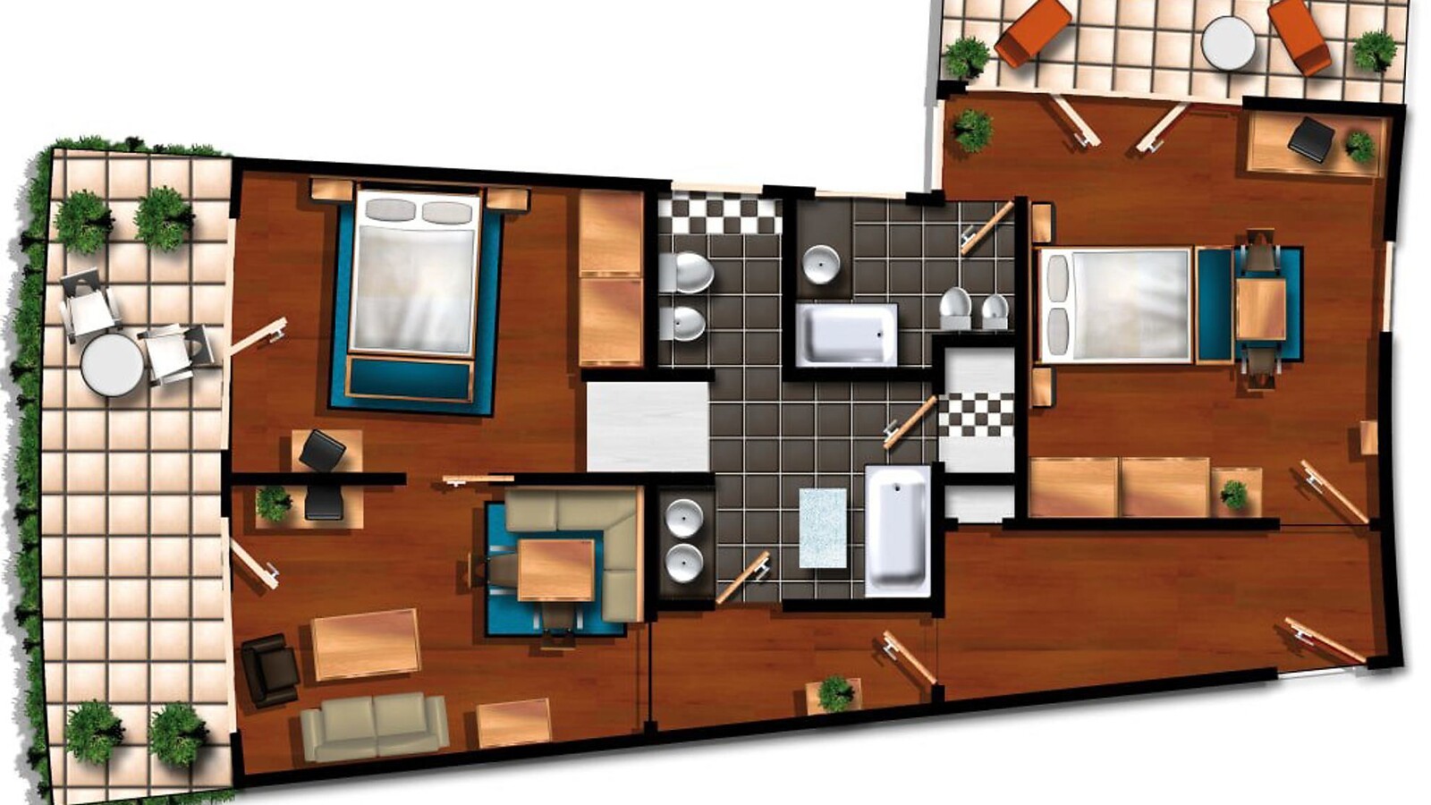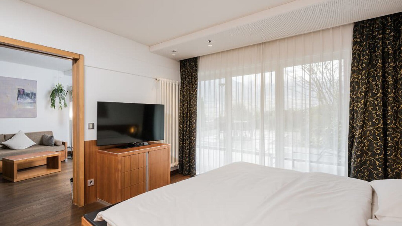 ca. 185 m² inkl. 100 m² Gartenterrasse für 2 - 6 Personen, großzügige Luxus Suite im 1. Stock, 2 Schlafzimmer mit Doppelbett, einem abgetrennten Wohnraum, 1 Bad mit Erlebnisdusche, Badewanne, Dampfsauna, Bidet, separates WC, 1 Bad mit Dusche, WC und Bidet, hochwertige Südtiroler Materialien (Lärche, Laaser Marmor, feine Stoffe und Designmöbel), Flat-TV, gratis W-Lan, Minibar, Safe, große Südterrasse, Garage