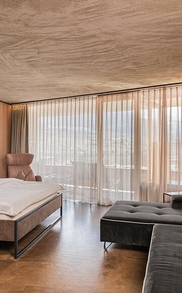 ca. 57 m² inkl. 12 m² Balkon für 2 – 4 Personen im Neubau, kuschelige, moderne Junior Suite, Einrichtungen aus Naturmaterialien, Naturestrichboden in Erdfarben, gebürstetes Vollholz in heimischer Lärche, grober Spritzputz an der Decke für angenehme Raumakustik, Schrank und Bett aus Leder, Schreibtisch aus Leder, Stehlampe mit Schlafcouch (französisches Maß) und Designer Lounge Sessel mit Beistelltisch, Flat TV, Badewanne mit Sicht in die Natur, Bad mit Doppel- Waschbecken, Dusche, WC mit Bidet, kostenlos W-Lan, Minibar, Safe und Garage - Haustiere nicht erlaubt