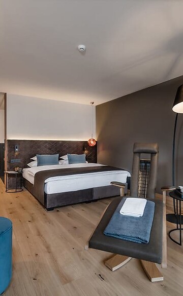 Die Suite mit einem gewissen Etwas. Moderne Suite in der 4. Etage. Offenes Badezimmer und abgetrenntes WC, Tageslicht in allen Räumen, geräumiger Wohn- und Schlafbereich und supergemütliche Infrarot-Liegen anstelle einer Couch. Ideal für alle, die sich nach dem Sport so richtig entspannen und die Muskulatur lockern wollen.