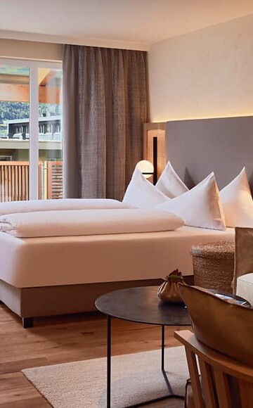 Einfach zum Verlieben. Unsere Romantik Suite mit exklusiv ausgestattetem Wohnraum mit gemütlicher Sitzecke und Couchsessel, Holzboden, Naturholzmöbeln, modernem Badezimmer mit großer Walk-In-Dusche, Doppelwaschbecken, separatem WC, romantischem Wandkamin mit Effektfeuer, hochwertigem Schrankbett für eine zusätzliche Person, Minibar, Safe, 55“ Flatscreen TV, Telefon, kostenlosem WLAN, großem Südbalkon mit Relaxliege, Garagenplatz und Klimaanlage.