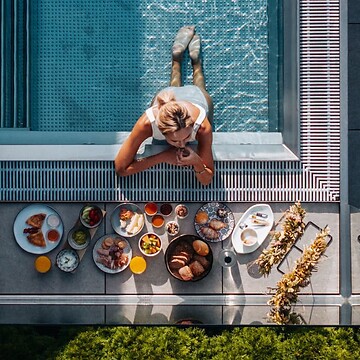 - Breakfast in the Pool – euer ganz privates, exklusives Frühstücksbuffet am Rand unseres Infinity Whirlpools auf der Dachterrasse