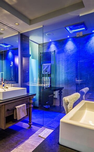 51m² including 12m² outdoor living room (loggia), luxury box-spring beds with "Sleep-Fit-Health-System" 210 cm long, comfort professional cabinet system, romantic designer chair, Dolby-Surround TV with Bluetooth, suitcase-style bar with wine, Nespresso & tea desk, designer bathroom with multi-sensory shower for two with light & sound system, lady's beauty desk, separate washbasin for him & her, separate toilet and bidet, outdoor living room in a private setting & day bed for two, comfortable seating, aromatic herbs, radiant warmers and lantern. In our DolceVita Lodge.