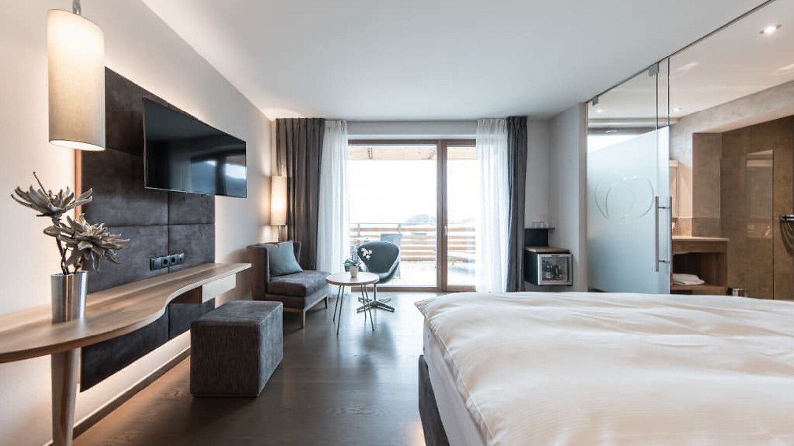 ca. 45-50 m² inclusive 6-10 m² pergola balcony, in unique ALPIANA design with oakwood floors, modern bathroom with shower and separate WC, views of the mountains and surrounding greenery, generously proportioned pergola balcony with outdoor furniture, flat-screen TV, safe, mini bar with South Tyrolean products, king-size double bed, with air condition