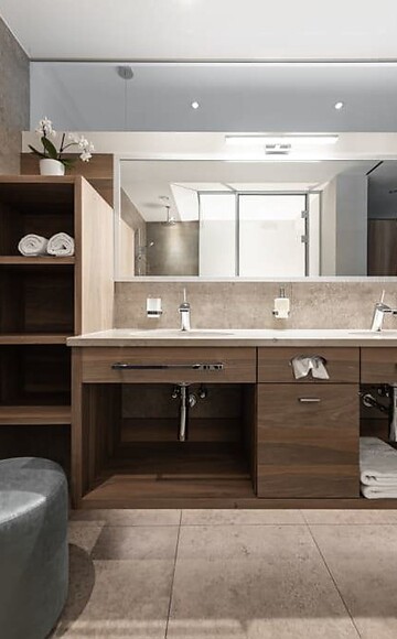 55-60 m² with 12-15 m² pergola balcony, in unique ALPIANA design with oakwood floors, large luxury bathroom with shower and separate WC, views of Alpiana pool gardens and surrounding greenery, on the 3d floor, , flat-screen TV, safe, mini bar with South Tyrolean products, king-size luxury bed, with air condition, generously proportioned pergola balcony with outdoor furniture, garage included