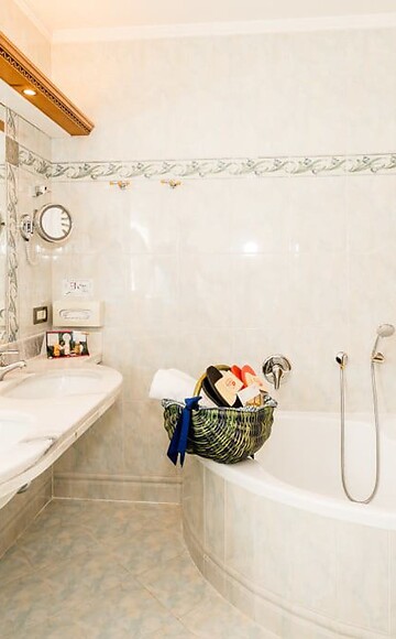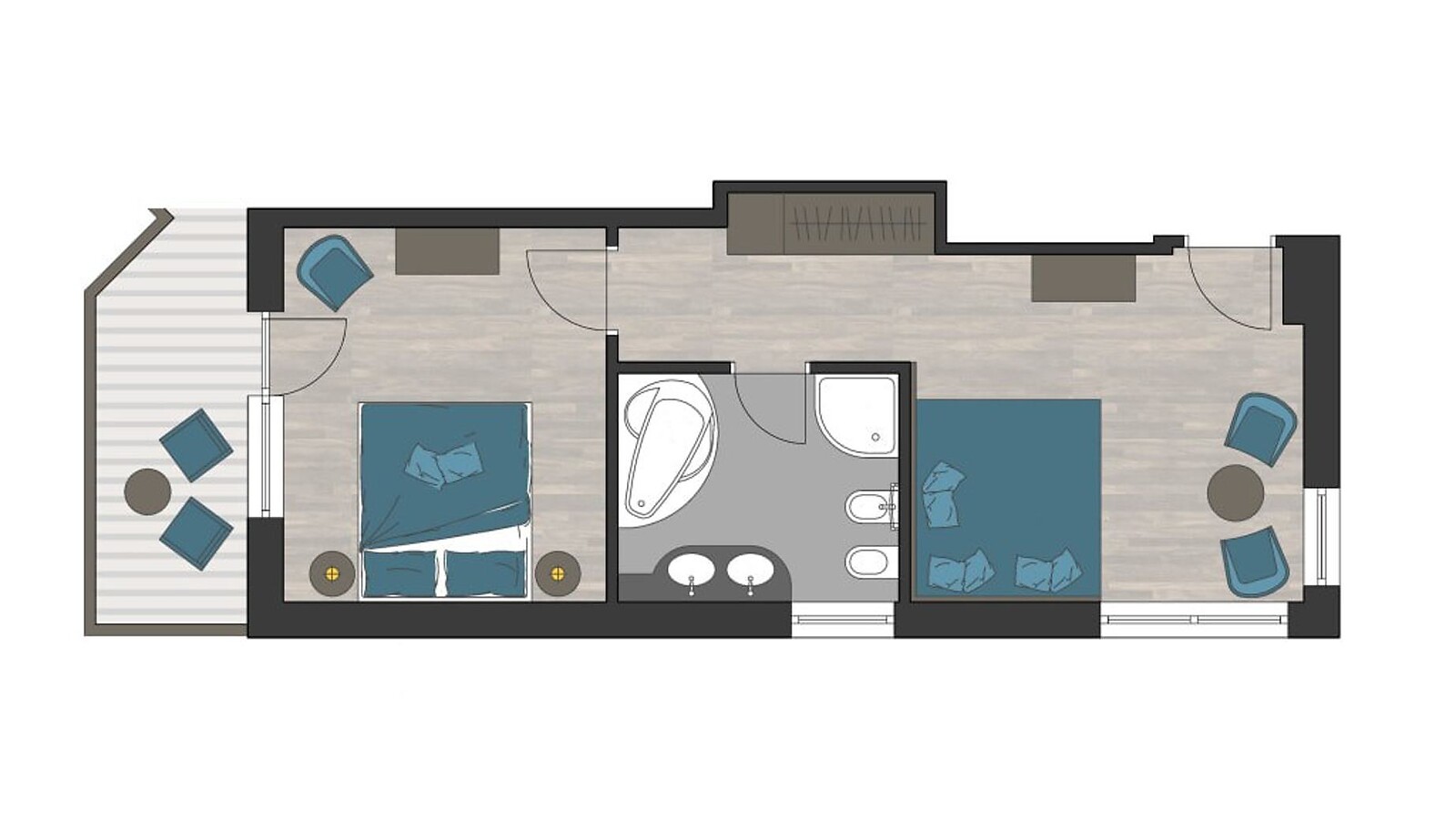 43-45 m² - Suite in part with separate sleeping and living area. Wooden floor and balcony with the morning or afternoon sun. Bathroom with shower and bath tub, in part double wash basin, WC, make-up mirror, hairdryer. Safe, satellite TV, WIFI and minibar