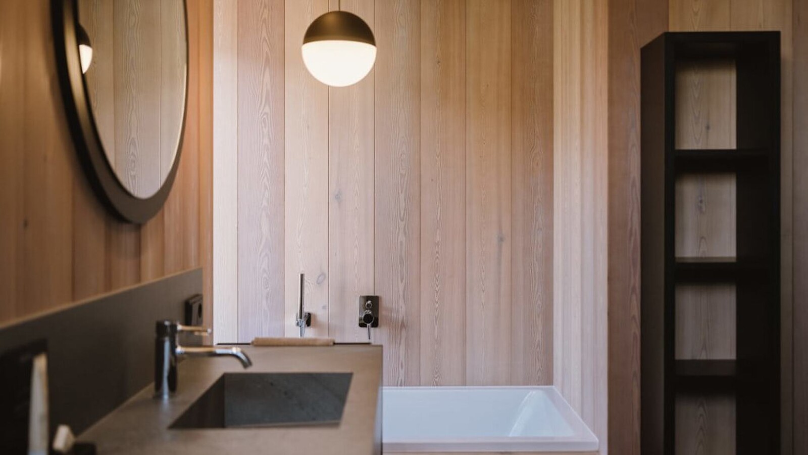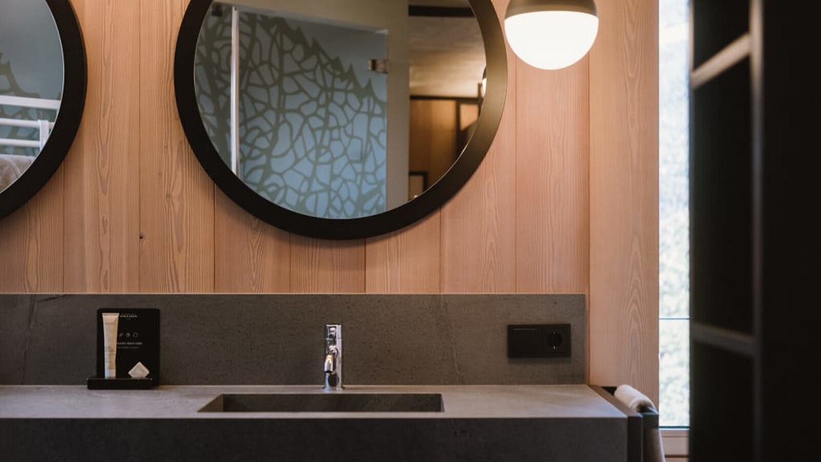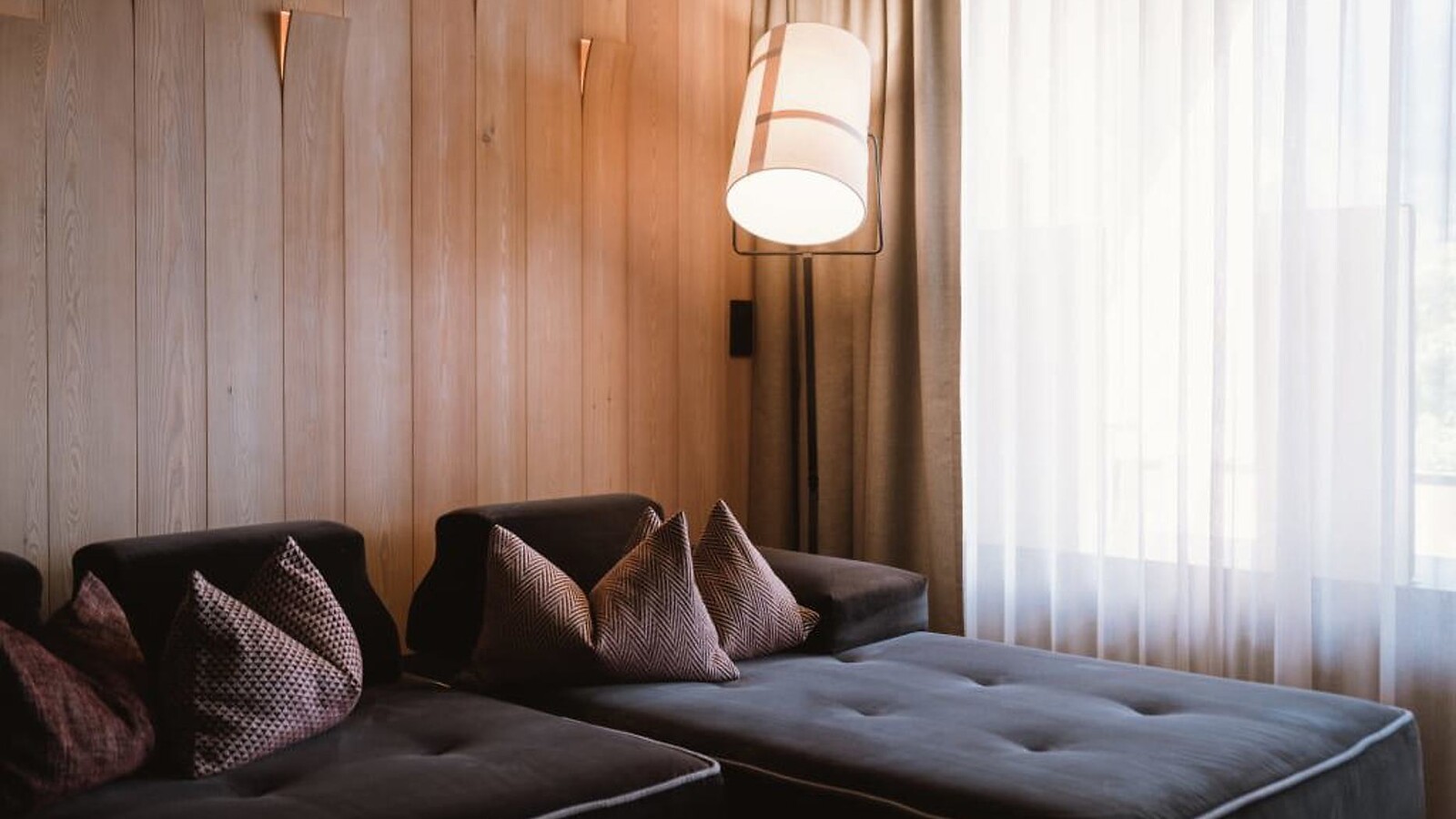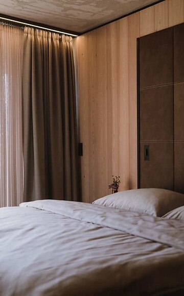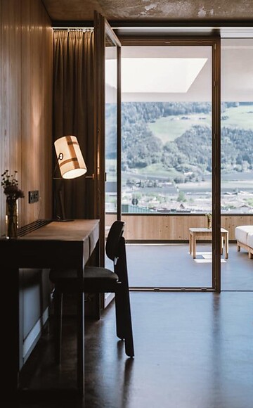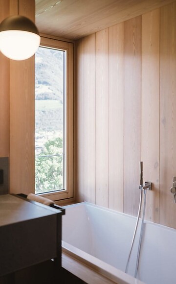 approx. 61 m² incl. 15 m² balcony for 2 - 4 people in the new building, cosy, modern suite, separate living room and bedroom, furnishings made of natural materials, natural cement flooring in earth tones, brushed solid local larch wood, rough plaster on the ceiling for pleasant room acoustics, wardrobe and bed made of leather, sofa bed (French size), leather desk, floor lamp withdesigner lounge armchairs, bathroom with double sink, shower, bathtub with views of the surrounding countryside, toilet and bidet, flat-screen TV, free Wi-Fi, minibar, safe, garage - pets not allowed