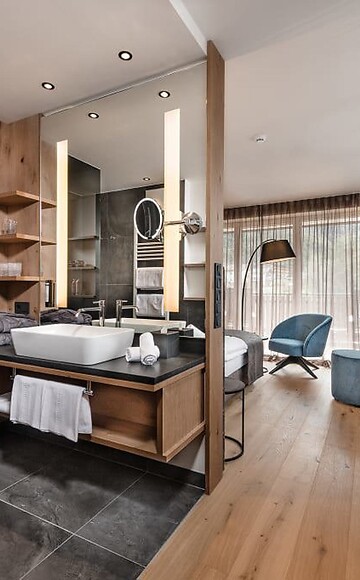 35-40m² - Luminous suite with a wooden floor, panoramic balcony with the afternoon sun and a magnificent view. Bathroom with shower, in part double wash basin, make-up mirror, hairdryer and in part a separate WC. Safe, satellite TV, WIFI and mini-bar.