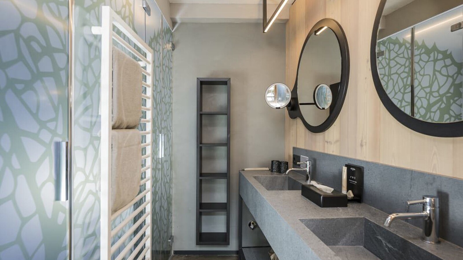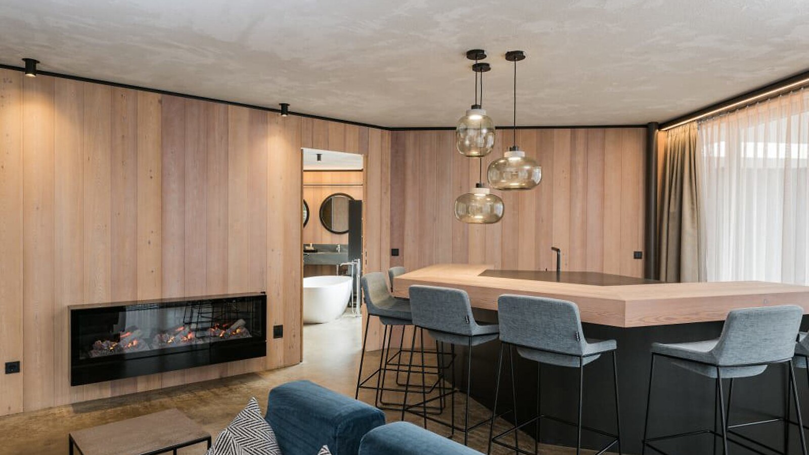 approx. 176 m² incl. 81 m² terrace, for 4 - 6 people in the new building, cosy, modern luxury family suite with 2 bedrooms and a separate living room area, furnishings made of natural materials, natural cement flooring in earth tones, brushed solid local larch wood, rough plaster on the ceiling for pleasant room acoustics, wardrobe and bed made of leather with sky views through the sky light, leather desk, floor lamp with sofa bed (French size) and designer lounge armchairs with side table, kitchenette (kettle, coffee bar, hob, cocktail bar, large dining table), fireplace, flat-screen TV, home cinema, 2 separate bathrooms with freestanding designer bathtub, bathroom with double sink, shower, toilet and bidet, free Wi-Fi, minibar, safe and garage - pets not allowed