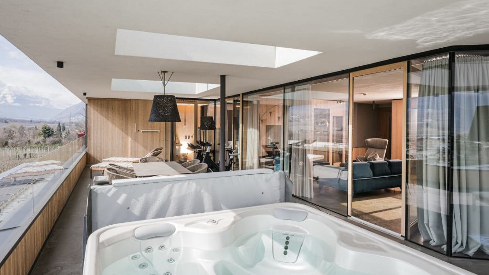 green terrace: with 4 sun loungers, side table and dining table, ambient lighting, couch and armchairs, with a spa area including an infrared sauna, combi sauna, whirlpool and spinning bicycles