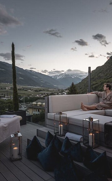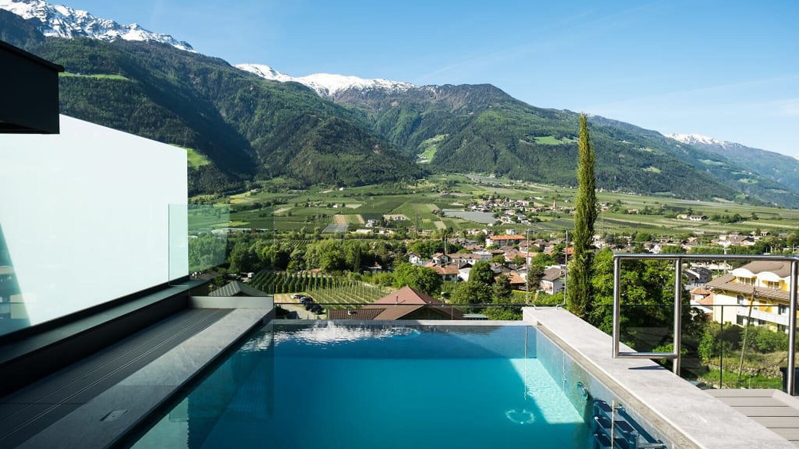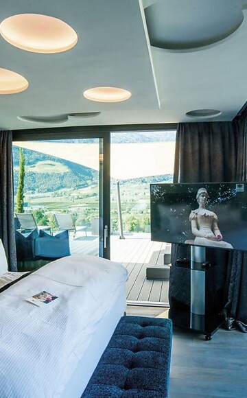 251m² two-bedroom Wellness Penthouse, 126m² of experiential panoramic terrace, swimming pool, sauna, fitness, fireplace, whirlpool & private Butler. South-facing, mountain views, expression of Preidlhof’s Wellness Concept to balance Hedonic & Eudaimonic wellbeing, Alps & Mediterreanean, nature & design. Sleep Well concept.