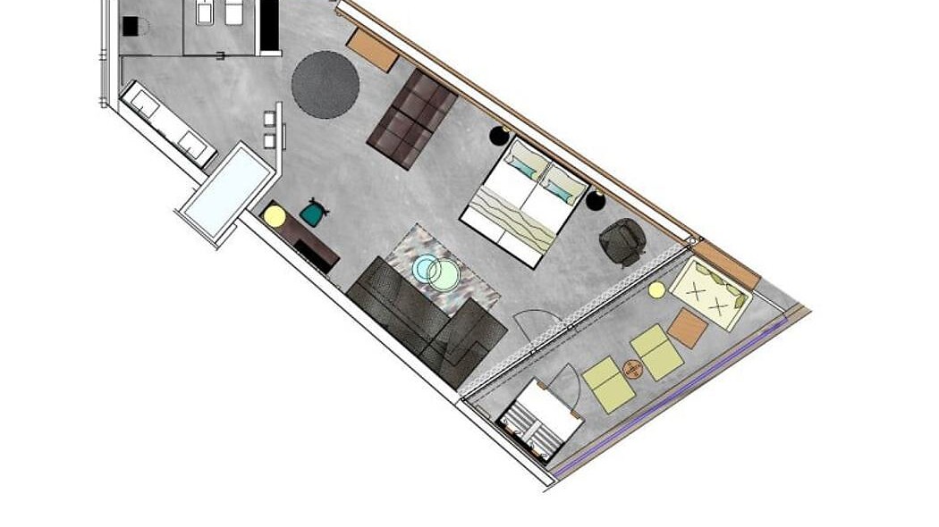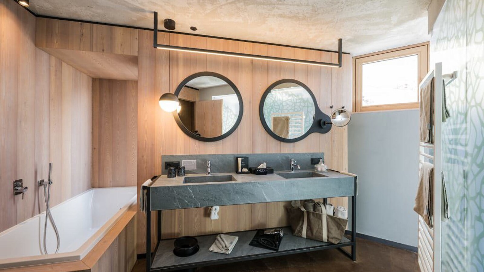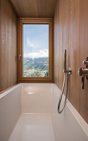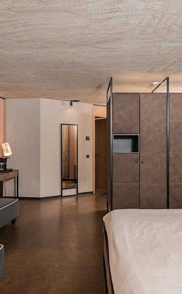 approx. 57 m² incl. 12 m² balcony for 2 - 4 people in the new building, Cosy, modern junior suite, furnishings made of natural materials, natural cement flooring in earth tones, brushed solid local larch wood, rough plaster on the ceiling for pleasant room acoustics, wardrobe and bed made of leather, leather desk, floor lamp with sofa bed (French size) and designer lounge armchairs with side table, flat-screen TV, bathtub with views of the surrounding countryside, bathroom with double sink, shower, toilet and bidet, free Wi-Fi, minibar, safe and garage - pets not allowed