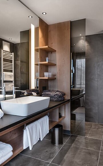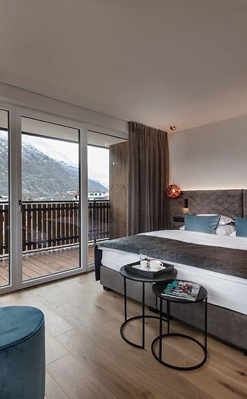 45 m² - Luxury suite with separate sleeping/living area, wooden floor, panoramic balcony with the morning and the evening sun and a magnificent view as well as a private whirlpool. Open bathroom with shower, wash basin, separate WC, make-up mirror and hairdryer, wellness bag with bathrobe and bathing slippers. Safe, TV, WIFI and mini-bar