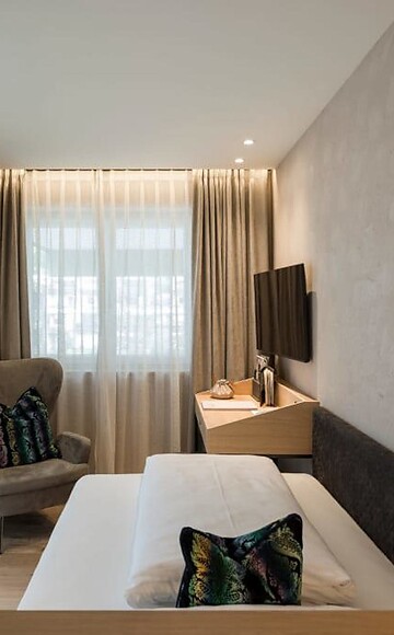 Entrare e sentirsi a suo agio. La nostra camera singola Nido del passerotto è arredata con un letto francese, accogliente poltrona, pavimento in legno, mobili in legno naturale, grande doccia walk-in, WC separato (senza bidet), frigobar, cassaforte, flat screen TV, telefono, WIFI gratuito, balcone rivolto a ovest con sdraio relax, parcheggio davanti all'hotel e aria condizionata.