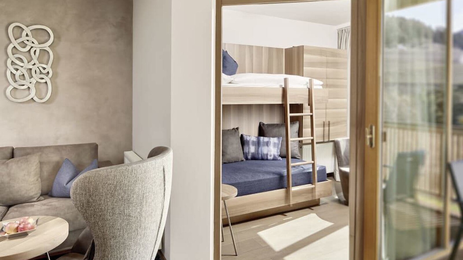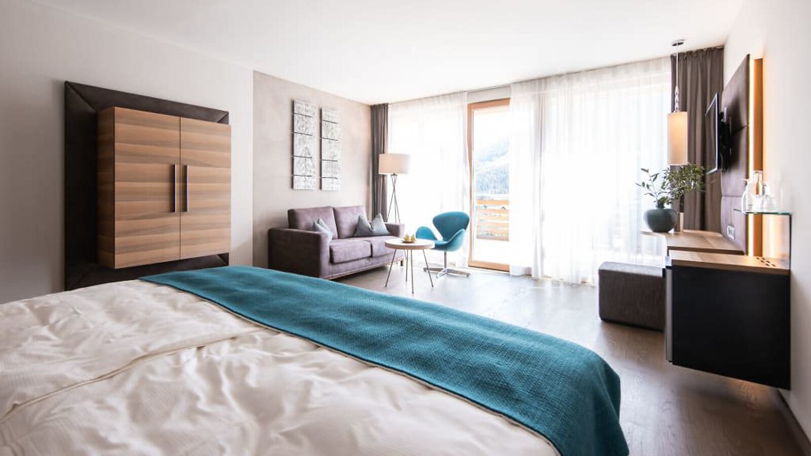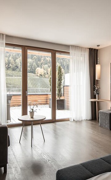 65 m² incluso 8 m² balcone a loggia, nuovo entrée e bagno con doccia lussuosa e wc separato, vista lato sud sul Pool Garden e sul verde circostante, ampio balcone a loggia, tv a schermo piatto, cassetta di sicurezza, minibar con prodotti dell'Alto Adige, lussuoso letto extra large, cameretta separata per 1-2 persone, con aria condizionata, parcheggio privato in garage incluso