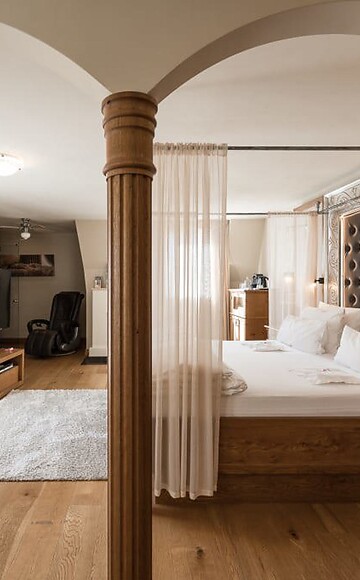 71m² compreso 6m² balcone esposto a est, arredamento classico ed elegante in legno naturale, nobile suite con grande area giorno-notte, letto a baldacchino di lusso "Romantic Dream" con cielo stellato e sistema Sleep-Fit-Health lungo 210 cm, spazioso sistema d'armadio comfort, sauna a raggi infrarossi, poltrona massaggiante relax, scrivania, romantico caminetto, TV Dolby Surround con DVD, small-bar con angolo vino, Nespresso e tè, spazioso bagno di lusso con doccia-relax per 2, vasca idromassaggio romantica con sistema Hygienic Luxury, lavabo pregiato, WC e bidet a parte, comodi mobili relax sul balcone, animali non ammessi. Nel Sonnenschlössl.