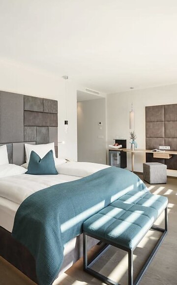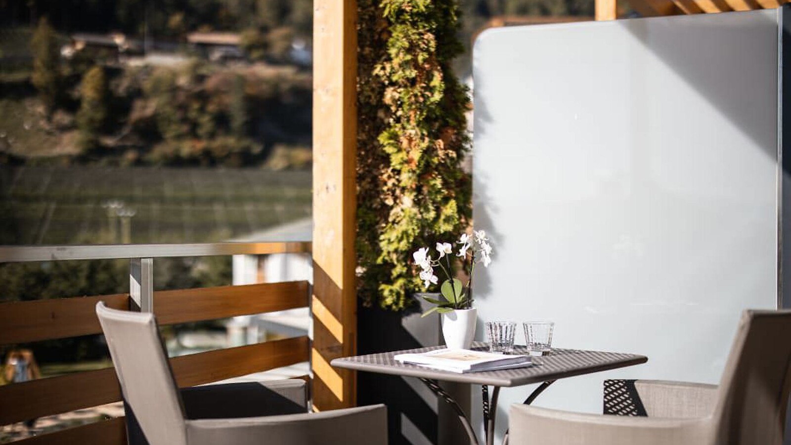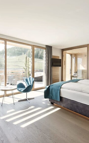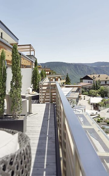 80 m² incluso 20 m² terrazza pergolata, dall'esclusivo design ALPIANA, con pavimento in legno di quercia, sauna finlandese privata, moderno bagno di lusso con doccia, vasca e wc separato, vista mozzafiato sulle montagne e sul verde circostante, al terzo piano, cabina armadio, tv a schermo piatto, cassetta di sicurezza, minibar con prodotti dell'Alto Adige, lussuoso letto extra large, con aria condizionata, ampia terrazza pergolata (20m²) con mobili outdoor e cocoon per momenti romantici, parcheggio in garage incluso