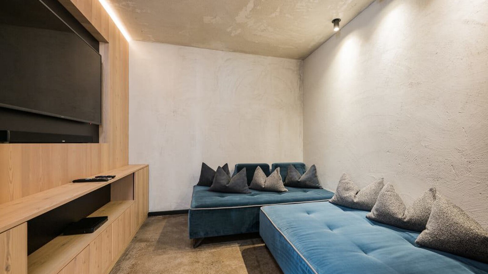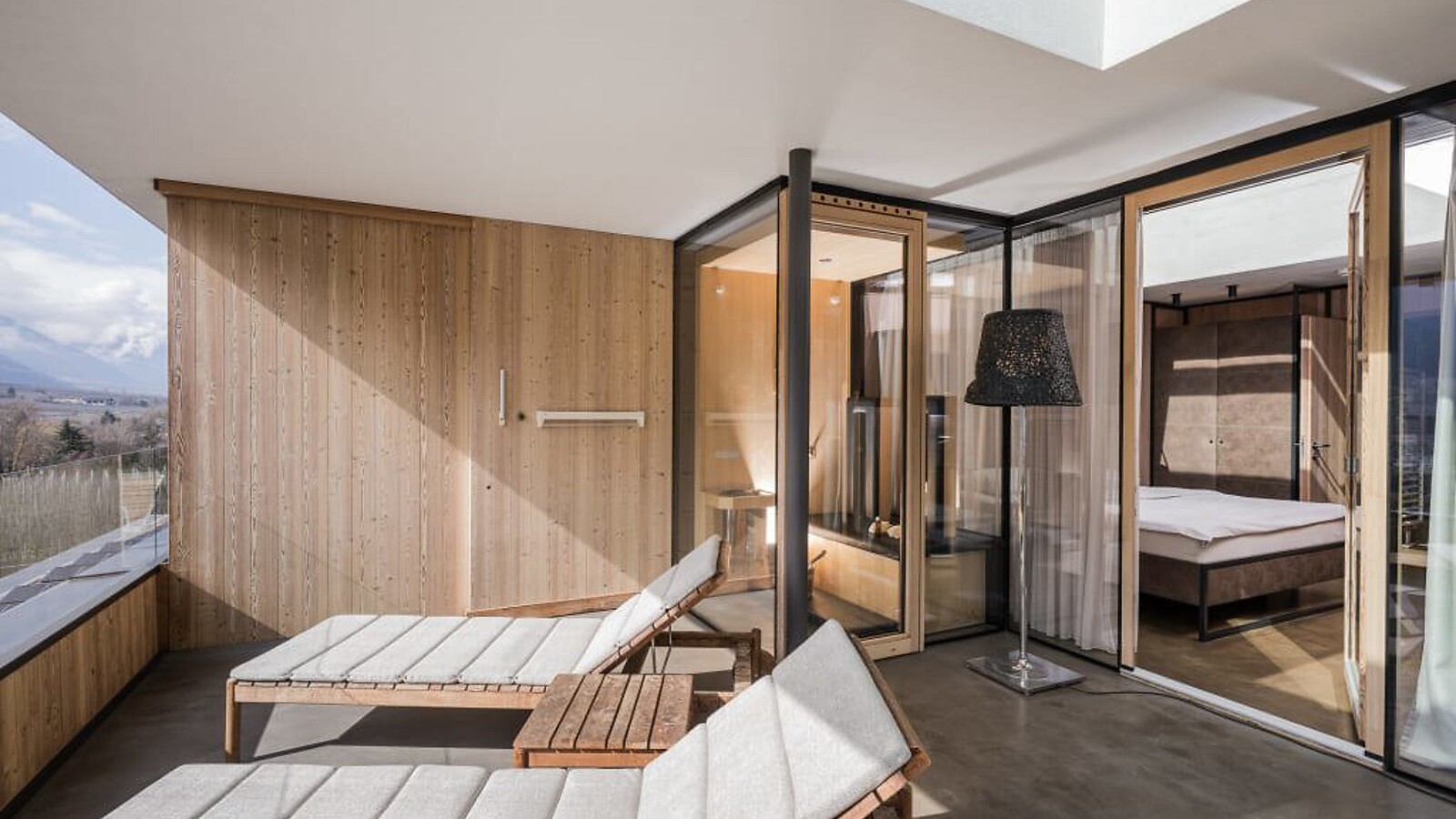 ca. 176 m² incl. 81 m² di terrazza per 4 - 6 persone nella nuova costruzione, Suite di lusso per famiglie accogliente e moderna, con 2 camere da letto e un soggiorno separato, arredamento in materiali naturali, pavimento in cemento naturale color terra, larice massiccio nostrano spazzolato, intonaco grezzo a spruzzo sul soffitto per una piacevole acustica ambientale, armadio e letto in pelle con vista cielo attraverso il soffitto, scrivania in pelle, lampada da terra con divano letto (misura francese) e poltrone di design con tavolino, cucinino (bollitore, angolo caffè, piano cottura, cocktail bar, grande tavolo da pranzo), caminetto, TV a schermo piatto, cinema privato, 2 bagni separati con vasca freestanding di design, bagno con doppio lavabo, doccia, WC con bidet, Wi-Fi gratuito, minibar, cassaforte e posto macchina in garage - animali domestici non ammessi