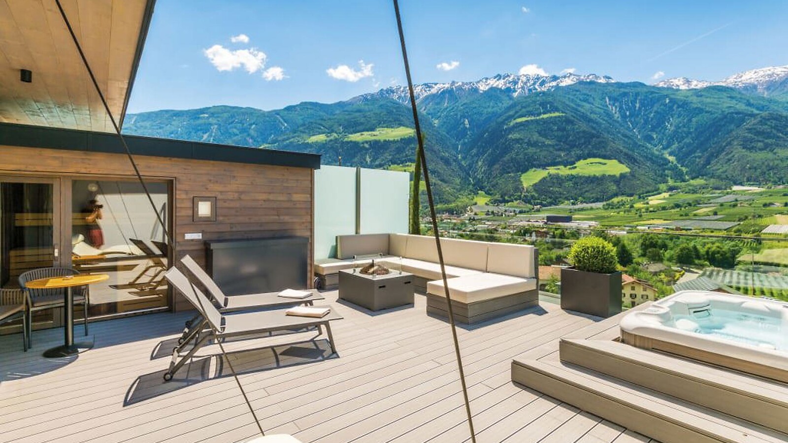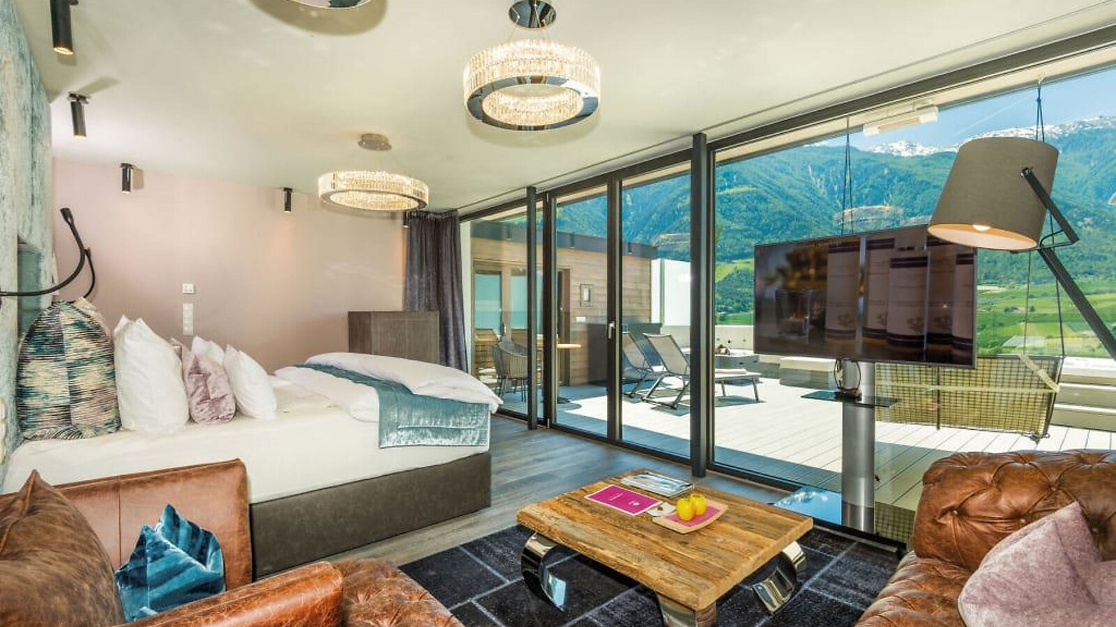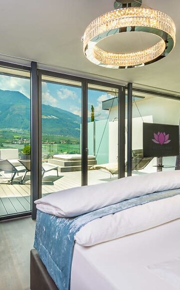 101m² compreso 56m² terrazza Penthouse outdoor con whirlpool, servizio maggiordomo privato, lounge giorno-notte aperta con caminetto romantico, letto di lusso boxspring con sistema Sleep-Fit-Health, 2 sedie relax di design, TV Dolby Surround con bluetooth, bar di design stile valigia con angolo vino, Nespresso e tè, lounge bagno con specchio di design in pietra dura con postazione make-up per Lei, doccia emozionale per 2 con impianto luce e audio, sistema d'armadio comfort professionale, terrazza Penthouse outdoor con atmosfera privata con idromassaggio di lusso con sistema Hygienic Luxury, sauna finlandese esterna con doccia emozionale per 2, lettino dondolo per 2, focolare "Sky Star" con lounge delle coccole, cinema outdoor, comodi mobili da esterno con tavolo da pranzo, erbe aromatiche, lampada riscaldante e lanterna, animali non ammessi. Nella DolceVita Lodge.